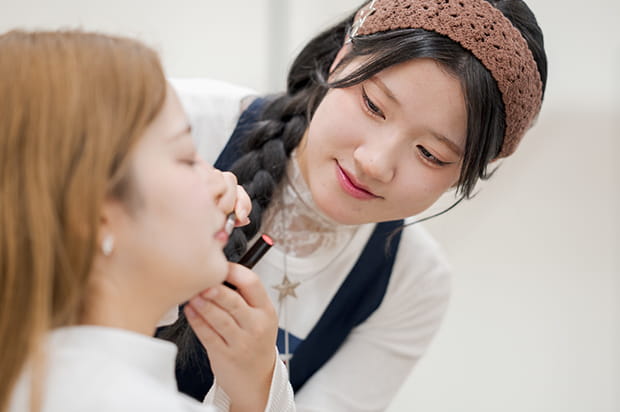 ヘアアレンジとメイクの基礎技術を習得。作品づくりを通じ、自分のイメージをカタチにする実践力が磨かれる。